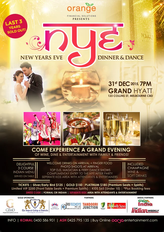 Oorja Entertainment proudly presents ‘2016' New Year’s Eve Dinner & Dance, A Class Evening of Wine & Dine. Prepare yourself to indulge in the Grand Experience of New Years Eve celebrations in Melbourne city’s world class 5 Star Venue, Grand Hyatt Melbourne. The Savoy Grand ballroom will be set to welcome you for the Ultimate Bollywood Red Carpet Experience! The photographers will be ready to greet you at the entrance to capture the beautiful you in your stylish outfits. The New Years Eve Social Affair is expected to spot Melbourne’s top Business class professionals and popular community personalities. The menu is set to give you the real taste bud torture, with a scrumptious 3-course dinner where you will be spoilt for choice. The Evening will feature sensational Latin & Bollywood Performances along with the amazing Moulin Rouge, which will set the rhythm to dance with rocking DJ’s who will be ready to storm the dance floor with the latest Bollywood dance numbers welcoming the New Year 2016.